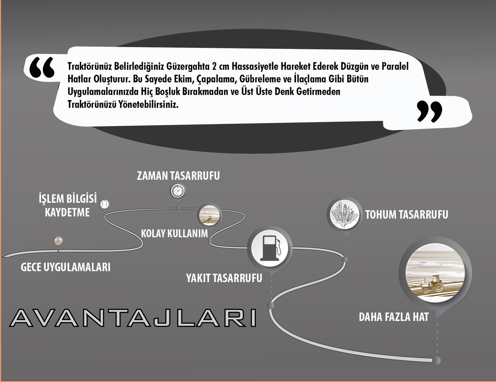 - TUSAGA-CORSTR üzerinden alınan hassaslaştırma sinyalleri ile 2 cm hassasiyetle işlemler yapabilirsiniz.